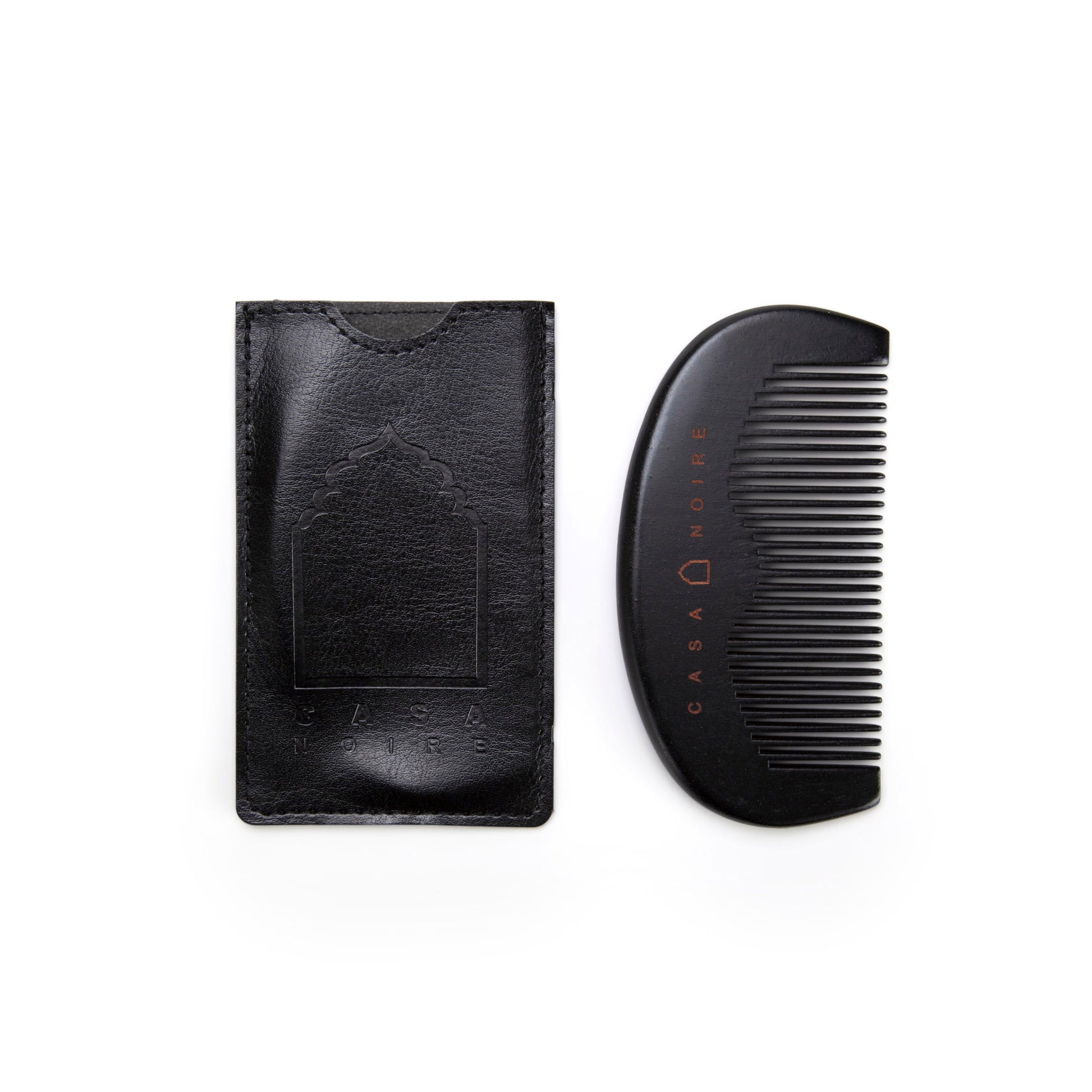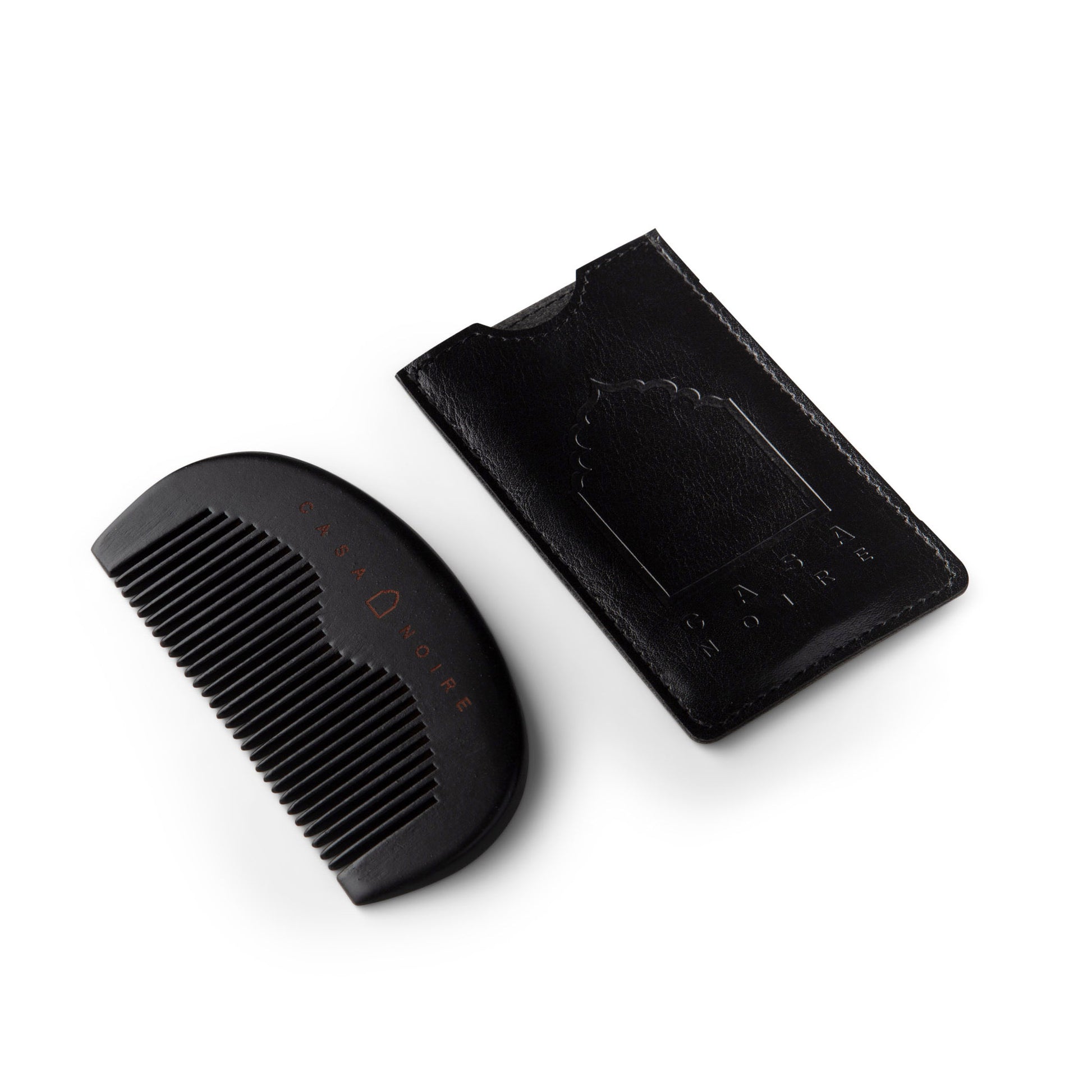 Vår lyxiga skäggkam i svart päronträd i ett konstläderfodral. Kammen är smakfullt graverad med Casa Noire loggan,